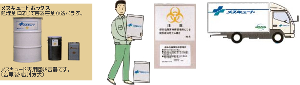 処理しなければなりません。「メスキュード」は、回収容器自体が密閉対応の金属製です。 - 回収後は専用車から人の手に触れずに、安全・確実に運び、そのまま電気炉へ投入できます。